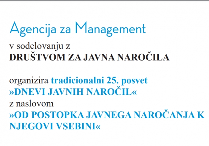 Agencija za Management 6. in 7. oktobra organizira tradicionalni 25. posvet »DNEVI JAVNIH NAROČIL« z naslovom: »OD POSTOPKA JAVNEGA NAROČANJA K NJEGOVI VSEBINI«, kjer bosta predavala tudi doc. dr. Boštjan Ferk, ki bo govoril o zasledovanju ciljev energetske učinkovitosti in krožnega gospodarstva, in univ. dipl. prav. Nina Pekolj, ki bo predstavila JN na področju digitializacije ("pametna mesta in skupnosti"). Dogodek bo potekal v Portorožu, v Kongresnem centru Portus, Hotel Slovenija.